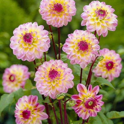 Эффектный сорт, легкий в посадке и выращивании. Глядя на его огромные пушистые соцветия, сложно подумать, что для их цветения достаточно просто предоставить растению солнечное место в саду и не забывать своевременно поливать. За минимальный уход георгина Avignon щедро дарит многоярусные соцветия. Они из миндалевидных кремовых лепестков, украшенных смелыми фиолетовыми мазками.