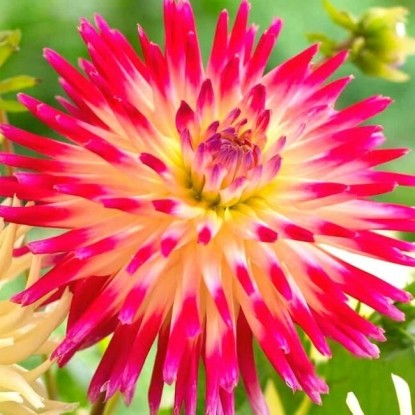 Георгина Tahiti Sunrise – обладатель фееричных махровых цветков, состоящих из сильно скрученных лепестков– иголок. Необычной многогранной окраски лепестки, незаметно переходящей в малиново-розовую, а затем – в основную лаймово-желтую. Этот сорт можно выращивать на балконе, в контейнере, во внутреннем дворике.