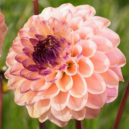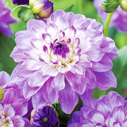 Георгина Bitsy обладает крепкими и прямыми побегами, чудом удерживающими огромные цветки со сложной и многогранной окраской. Миндалевидные лепестки складываются в пушистые цветки со строго очерченными контурами, а внутри образуют плотный сиреневый помпон с зеленым основанием. Кончики лепестков выкрашены в деликатный лавандовый оттенок, который легко и непринужденно переходит в белый и заканчивается лимонно-желтым.