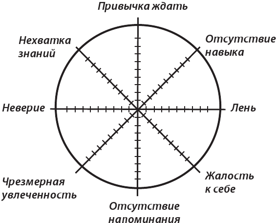 Нанесите на штурвал риски. Итак, на 4–6 развиты неверие в себя, жалость к себе, незнание, как и с чего начать; на 8 – лень, напоминания со стороны, чрезмерная увлеченность другими делами (рис. 6).