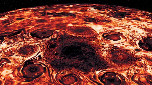 Рис. 81. Вид на южный полюс Юпитера в съемке мультиспектральной камерой зонда Juno. Любительская фотообработка и цветокоррекция. Источник: NASA/JPL–Caltech/SwRI/MSSS/Betsy Asher Hall/Gervasio Robles