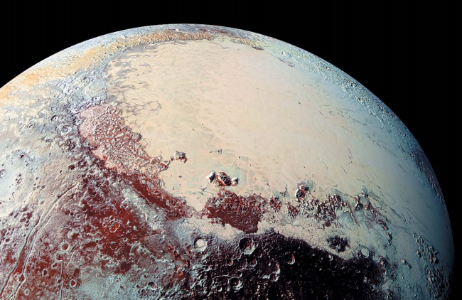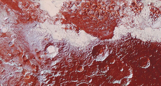 Рис. 86. Близкий вид на Плутон: равнина Спутника. Цвета усилены для определения различных типов поверхности. Съемка зонда New Horizons. Источник: NASA/Johns Hopkins University Applied Physics Laboratory/Southwest Research Institute