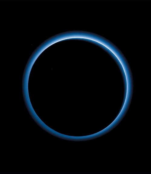 Рис. 89. «Солнечная система – вид сзади». Свечение атмосферы карликовой планеты в лучах Солнца в момент пролета зонда New Horizons через тень Плутона. На этом снимке все известные планеты и Солнце находятся за карликовой планетой. Источник: NASA/Johns Hopkins University Applied Physics Laboratory/ outhwest Research Institute