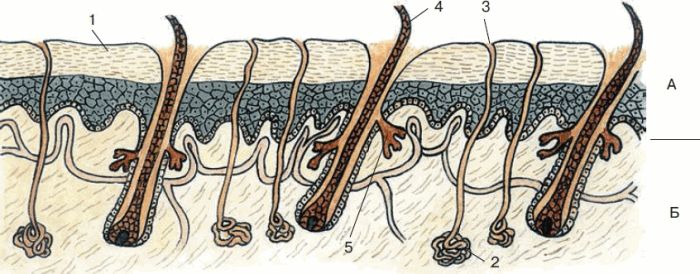 Рис. 145. Покровы тела хордовых животных. А – многослойный эпидермис; Б – собственно кожа: 1 – роговой слой; 2 – потовая железа; 3 – проток потовой железы; 4 – волос; 5 – сальная железа