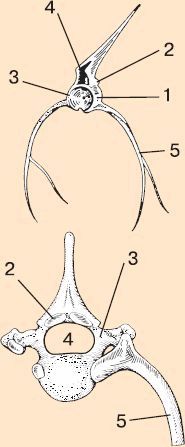 Рис. 147. Позвонки позвоночных животных: 1 – тело позвонка; 2 – верхние дуги; 3 – нижние дуги; 4 – канал спинного мозга; 5 – ребра