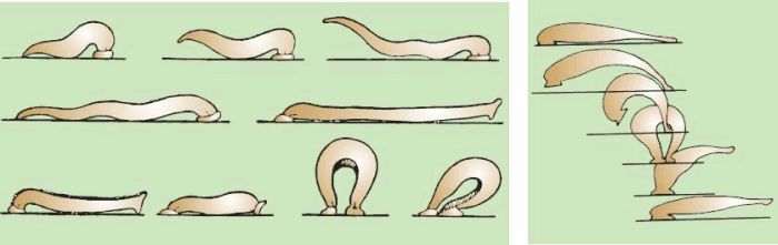 Пиявки освоили шагающие движения, используя для прикрепления присоски (рис. 154). Брюхоногие моллюски двигаются благодаря волнам сокращения, пробегающим по подошве ноги. Обильно выделяемая слизь облегчает скольжение и ускоряет движение. Двустворчатые моллюски двигаются с помощью мускулистой ноги, а головоногие освоили реактивный способ передвижения, выталкивая воду из мантийной полости.
