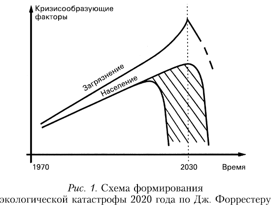 В официальных кругах до 1970-х годов прошлого века светлое будущее человечества воспринималось экологически безоблачным как в капиталистическом, так и в социалистическом мире. Но ученых по обе стороны океана весьма тревожила угроза надвигающейся экологической катастрофы. Поэтому неудивительно появление в Риме группы энтузиастов из авторитетных на международном уровне людей, объединившихся в так называемый Римский клуб. Задачей клуба, по замыслу его основателя Аурелио Печчеи, должна была являться инициация борьбы ученых во всем мире за спасение природы. Экологический Римский клуб постепенно, добыв деньги, стал организовывать исследовательские работы. В частности, профессору Калифорнийского университета Дж. Форрестеру было поручено сделать долгосрочный прогноз. Он был опубликован в 1970 году в книге «Мировая динамика» и вызвал оглушительный отклик. И в США, и в СССР начали упрекать автора в паникерстве. Расчеты предсказывали через 50 лет, то есть примерно в 2020 году, катастрофическое снижение численности населения нашей планеты из-за недопустимого загрязнения среды обитания [62. С. 216].