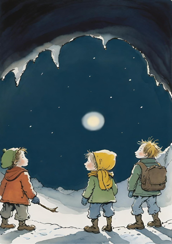 Когда они добрались до узкой тропинки, ведущей вглубь горы, дорогу преградила широкая замерзшая река. Лед казался прочным, но при каждом шаге издавал зловещий хруст. Лео, Марти и Луна переглянулись, взяли друг друга за руки и, стараясь дышать как можно тише, начали двигаться по хрупкому льду. В какой-то момент лёд под ногой Лео предательски треснул, и он чуть не упал, но Марти и Луна схватили его за обе руки и крепко удержали, не дав ледяной воде утащить друга в глубину.