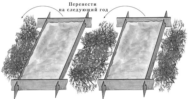 Конечно, лучше всего грядки окантовать, во-первых, проще истребить слизняков и улиток, во-вторых, не будет грязи под ногами в проходах, в-третьих, на грядки не будут лезть из прохода сорняки. В проходы между грядками все лето складывайте выполотые сорняки (и естественно, ходите по ним). На следующий год вы будете менять местами грядки и проходы, поэтому сразу сделайте такие короба, чтобы можно было их легко разбирать и собирать. Обратите внимание на рис. 3.