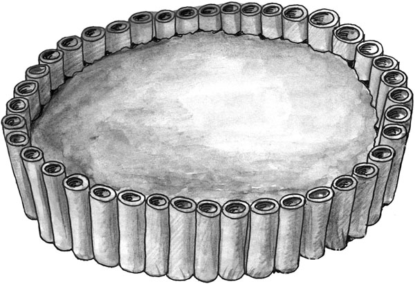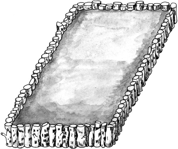Грядки не обязательно окаймлять плоским шифером, хотя это наиболее хороший вариант в смысле их долговечности (рис. 4). Прекрасно выглядят грядки, окаймленные березовыми чурками (рис. 5) или более примитивно – старыми (или новыми) досками (рис. 6) и даже плоскими металлическими батареями, раскрашенными различным образом. Если есть в семье подростки, увлекающиеся граффити, вот и отдайте им грядки на откуп, глядишь, и полюбят что-нибудь растить на них. Окаймлять грядки, а особенно цветочные клумбы, можно даже бутылками из-под шампанского. Их надо воткнуть горлышками в почву плотно друг к другу. Тем более что бутылки и березовые чурки позволяют делать грядки любой конфигурации, а не только прямолинейные (рис. 7).