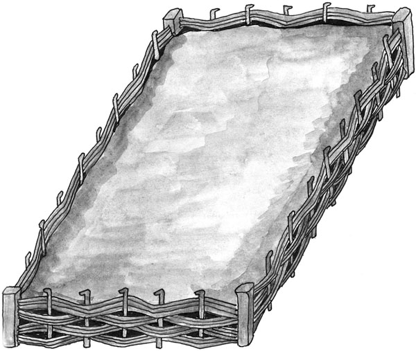 Особенно красиво выглядят окантовки в виде плетня (рис. 8). Плетень повыше может превосходно отделить огород от зоны отдыха. Особенно если сразу за плетнем перед огородом высадить подсолнухи или кукурузу, либо посеять семена космеи. Перед плетнем со стороны участка можно посадить тыквы, плети которых пустить по плетню сверху. Можно в плетне сделать проем для арки-входа в зону огорода и высадить с двух сторон от арки тыквы или кабачки, запустив их плети по арке. Право же, это выглядит очень эффектно. Можно отделить регулярный огород перголой, по которой запустить фасоль (в том числе и декоративную) или горох совместно с душистым.