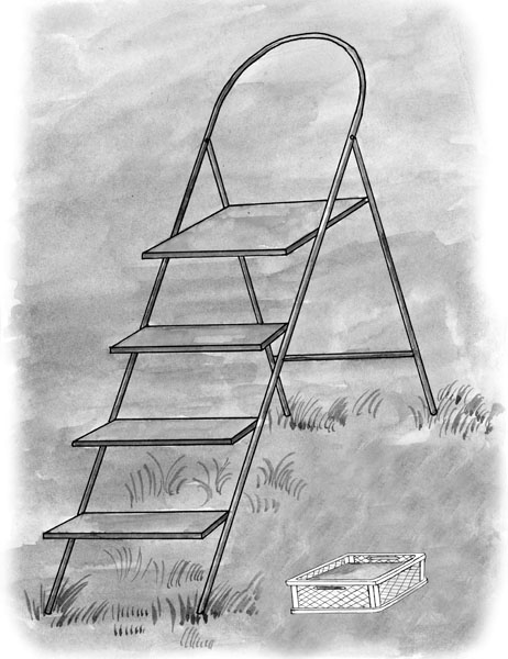 Кроме того, такие мини-грядки можно использовать там, где мало места. Вместо грядок-коробов можно использовать решетчатые ящики, которые можно поставить на стремянках или на кронштейнах, закрепленных на южной стене или на крыше гаража и сарая (рис. 9). Ящики следует изнутри выстелить полиэтиленовой пленкой, сделать на дне несколько отверстий для стока лишней воды и заполнить почвосмесью. Конечно, для выращивания капусты или перца такие грядки не годятся, но вот создать из них ароматные квадраты удобно. В каждый ящик высеваете семена одного пряно-вкусового растения: фенхеля, кинзы, укропа, лука на зелень, листовой петрушки, кервеля, майорана, разных сортов базилика в разных ящиках, и расставляете ящики на стремянке, поближе к обеденному месту.