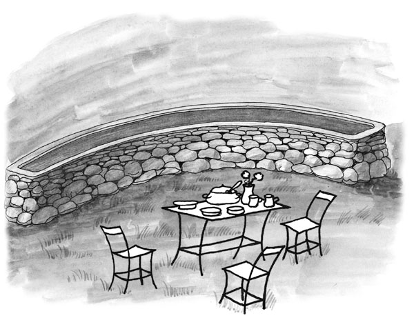 Высокие грядки обычно имеют высоту 75–80 см, чтобы на них было удобно работать, не наклоняясь. Они, конечно, требуют трудоемкой работы, но и служат много лет. Без окантовки такие грядки делать бессмысленно. Естественно, что и окантовку надо делать долговечную и красивую. Часто окантовку делают из кирпича или камней, положенных на цемент (рис. 10), или шифера, но можно использовать старые плоские отопительные батареи. Кроме того, можно сделать окантовку из деревянных реек, закрепив их горизонтальными досками, которые лучше прибивать изнутри. Рейки можно располагать примерно на расстоянии 6–8 см друг от друга, а чтобы почва не проваливалась через отверстия, изнутри прибивают рубероид. Ширина такой грядки примерно метр, а проходы с двух сторон можно оставить всего по 40–50 см.