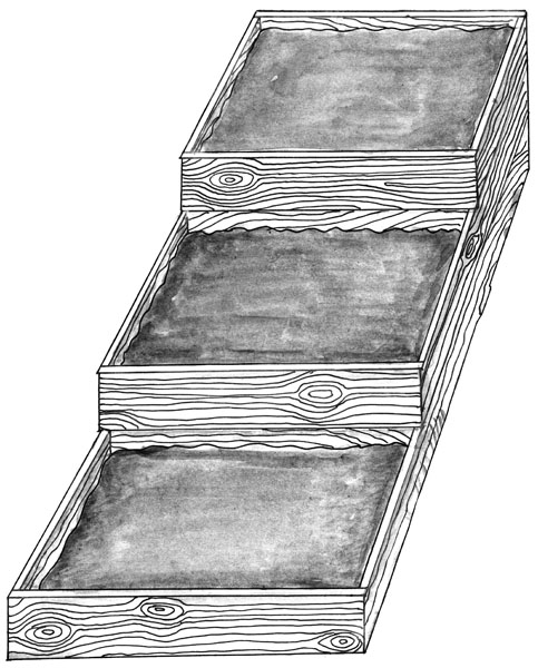 Сначала строите высокую грядку 1×1 м высотой 1 м (куб). Заполняете его постепенно в течение первой половины лета, как было сказано выше. По мере заполнения все время накрывайте газетами, сложенными в несколько слоев, чтобы не допустить сорняков. Пристраиваете к нему с южной стороны 3 стенки высотой 75 см, получится еще одна емкость. Начинаете заполнять ее. В конце лета пристроите с юга еще 3 стенки высотой 50 см, заполните внизу неперепревшим компостом, сверху хорошей почвой (перепевшим компостом). Осенью пристроите с юга еще 3 стенки высотой всего 25 см и заполните ее хорошо перепревшим компостом. Если перепревшего компоста нет, то во все секции закладывайте компост, но обязательно поливайте его по мере заполнения каскада «Фитспорином». Когда работа по закладке каскада будет закончена, полейте «Фитоспорином» плюс «Гуми» и накройте черным спанбондом.