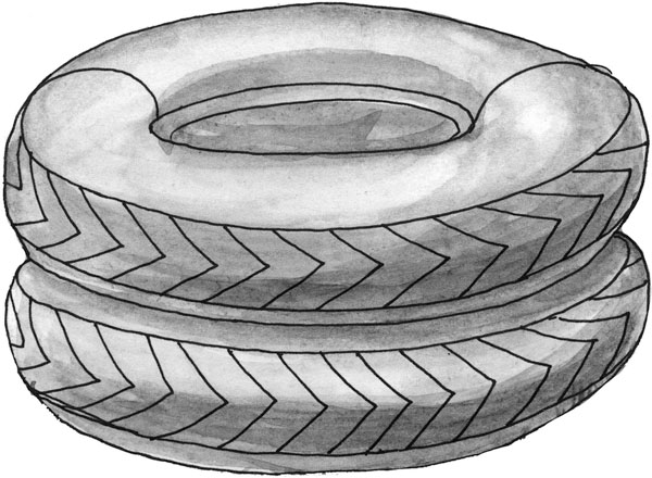 Цилиндр можно сделать не из рубероида, а из автопокрышек, сложенных друг на друга (рис. 12). В таких же вертикальных грядках хорошо выращивать рассаду различных культур. После этого высадить в них кабачки или другие растения. Если в одном месте поставить одну покрышку, а рядом с ней две – поставленные друг на друга, и еще три, то, посадив в них плетистые кабачки разного окраса, вы создадите на своем огороде маленький шедевр. Кустовые тыквы, высаженные в покрышки и расставленные в разные места сада, отнюдь не испортят его вида, а наоборот украсят. Но нельзя в такие сооружения сажать землянику, потому что зимой цилиндр промерзает, и в тех регионах, где морозные зимы, земляника погибнет. Весной, чтобы растопить лед, который обязательно образуется в нижней части цилиндра, почву в этих вертикальных грядках проливают очень горячей водой.