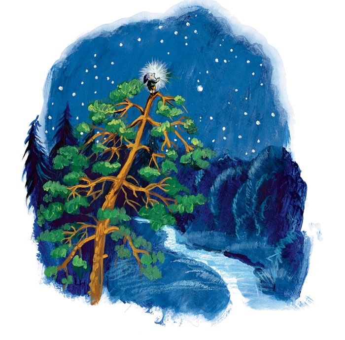 И он, закинув Звезду за спину, полез на самую высокую сосну. И не сосчитать, сколько раз он с неё падал и сколько шишек и синяков набил. Но, как известно, упрямство гномов не знает границ. И, в конце концов, он всё-таки оказался на самой верхушке сосны. Однако и эта его попытка не увенчалась успехом. Оказалось, что даже самая верхушка самой высокой сосны находится слишком далеко от неба.