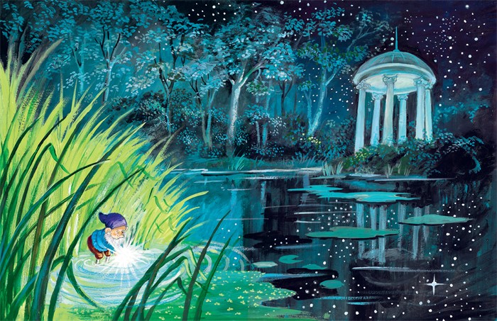 Но Гном не отвечал. Он угрюмо смотрел на лунную дорожку, протянувшуюся по озеру. Внезапно отсвет лунного света упал на лицо Гнома. И что-то в нём сразу изменилось. Как будто лунный свет подсказал Гному какую-то мысль, после чего он посмотрел на озеро совсем другими глазами. И теперь это было вовсе не озеро, а звёздное небо. Действительно, на зеркальной глади озера во всей своей красе отражалось звёздное небо. Словно звёзды спустились с неба на землю. Точнее, на воду…
