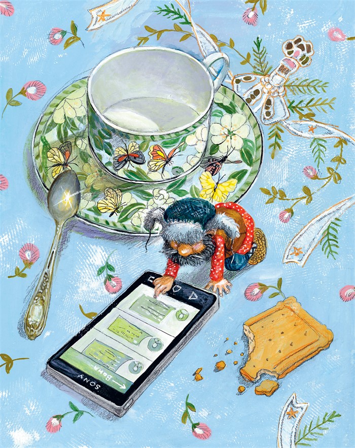 Неожиданно со стола раздался какой-то странный звук. Это ожил лежавший на столе телефон Хозяйки. Антип вздрогнул, поглядел наверх, потом подпрыгнул, ухватился за край скатерти и, пыхтя и кряхтя, полез по ней вверх. Конечно, домовые не рождены для лазания по скатертям и совсем не приспособлены к этому, но их природное упрямство и упорство способно преодолеть любые преграды. Когда Антип, наконец, на последнем издыхании добрался до стола и, шумно отдуваясь, уселся передохнуть на край блюдца, телефон снова звякнул. Его экран засветился, и появилась надпись «15 пропущенных СМС».