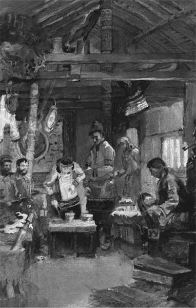 Что такое очаг? Это низкая печка, сложенная из дикого камня, в которую сверху вмазан довольно большой котел. Дымовые ходы проложены под канами и выведены наружу в трубу, сделанную из дуплистого дерева и стоящую несколько поодаль от фанзы. Обыкновенно топится та печь, которая находится ближе к дверям. Вторую печь топят только зимой, во время больших морозов. Естественно, что каны ближе к топке нагреваются сильнее, чем те места, где дымоход выходит наружу. Иногда каны нагреваются так сильно, что без досчатых подстилок спать на них невозможно. Около очагов имеются полочки, на которых всегда можно увидеть одну или две бутылки, деревянные корытца, берестяную посуду, поварешку, кухонный нож и коробку с палочками для еды. Немного в стороне, прямо на полу, стоит большой глиняный сосуд для воды. Он высотою в метр и вместимостью ведер на двадцать. Эту глазированную и хорошо обожженную посуду раньше гольды приобретали в Маньчжурии. Посредине фанзы устроены на стойках в два ряда полки, на которых сложены разные охотничьи принадлежности, как то: рыболовные крючки, остроги, копья, луки и стрелы. На жердях, протянутых через всю фанзу, над канами лежат лыжи, весла от лодок, большие куски бересты и свертки рыбьей кожи. Вследствие того, что дымовые ходы очень длинны и расположены горизонтально под канами, тяга в них не всегда равномерна, и печи часто дымят. Поэтому все предметы, находящиеся в фанзе выше роста человека, так закопчены, что не всегда удается узнать, что именно находится под слоем копоти. Неосторожный человек при малейшем прикосновении к ним осыпается в изобилии серой пудрой.