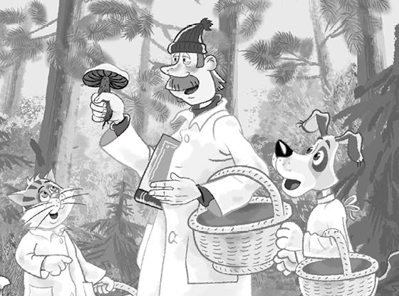 Печкин, кот Матроскин и Шарик с корзинками весь лес обыскали. Наконец Матроскин закричал:
