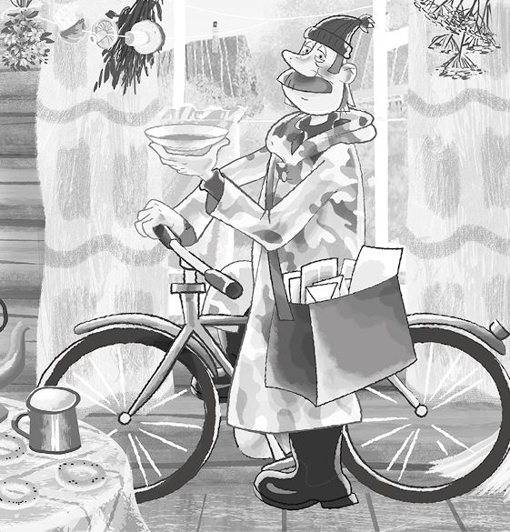 Он быстро сбегал в сарай, прикатил велосипед, надел на себя плащ почтальонский и сумку. И только тогда уселся у окошка.