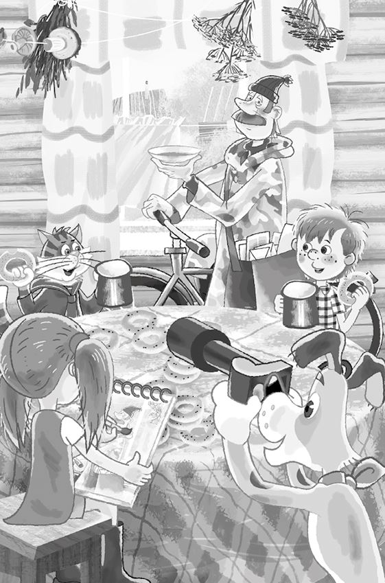 В доме у Печкина мебели не густо было. Печь огромная, стол, шкаф и три табуретки. Ещё радиоточка. Для такого большого количества гостей пришлось у соседей лавку брать. Печкин гостям обрадовался, чаю накипятил, баранок на стол положил очень много. Если на столе сначала спичку положить как цифру один, а потом эти баранки, цифра в много-много миллиардов рублей получилась бы. И ещё всякое варенье кругом стояло, и конфеты.