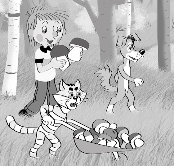 Так они и сделали. Дядя Фёдор и Матроскин с корзинками домой пошли за тележкой, а Шарик остался грибы нюхать и в кучку складывать.