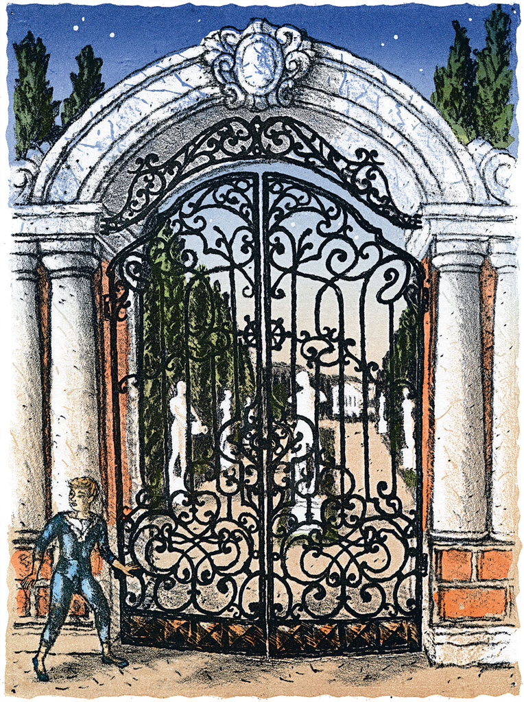 Беззвучно проскользнул Сергей в деревянную калитку, ведущую в парк. Там, под густыми деревьями, было совсем темно. Издали слышался шум неугомонного ручья и чувствовалось его сырое, холодное дыхание. Отчетливо застучала под ногами деревянная настилка моста. Вода под ним была черная и страшная. Вот, наконец, и высокие чугунные ворота, узорчатые, точно кружево, и обвитые ползучими стеблями глициний. Лунный свет, прорезавшись сквозь чащу деревьев, скользил по резьбе ворот слабыми фосфорическими пятнами. По ту сторону был мрак и чутко-пугливая тишина.