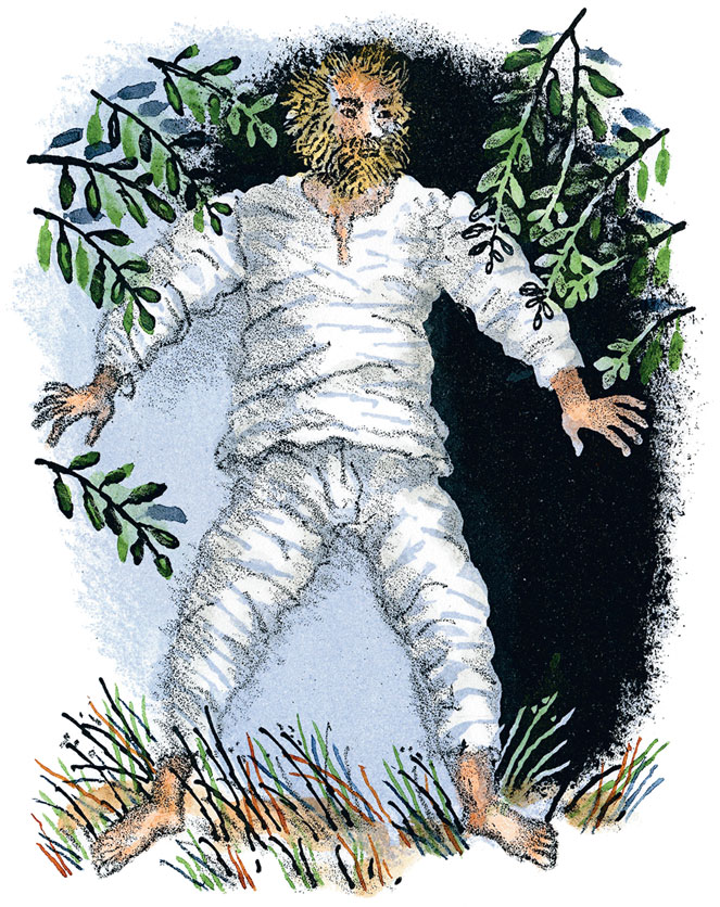 По тропинке быстро спускался вниз, неразборчиво крича и махая руками, тот самый мрачный дворник в розовой рубахе с черными горошинами, который четверть часа назад гнал странствующую труппу с дачи.