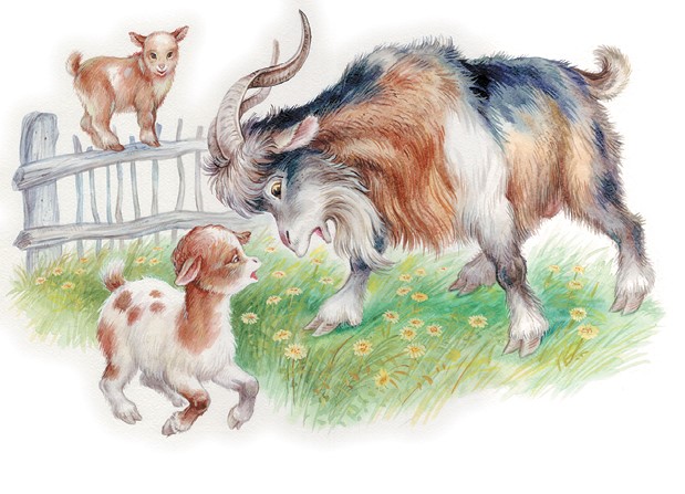 Идёт козёл мохнатый, идёт бородатый, рожищами помахивает, бородищей потряхивает, копытками постукивает: идёт, блеет, коз и козляток зовёт. А козочки с козлятками в сад ушли, травку щиплют, кору гложут, молодые прищепы портят, молоко деткам копят; а козлятки, малые ребятки, молочка насосались, на забор взобрались, рожками передрались.