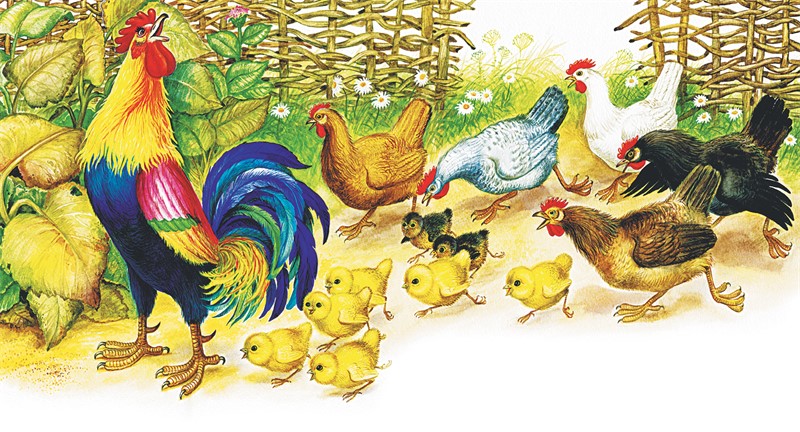 Курочки с цыплятками собирались, раскудахталися; зёрнышком не поделились – передралися. Петя беспорядков не любит – сейчас семью помирил: ту за хохол, того за вихор, сам зёрнышко съел, на плетень взлетел, крыльями замахал, во всё горло заорал: «Ку-ку-ре-ку!»