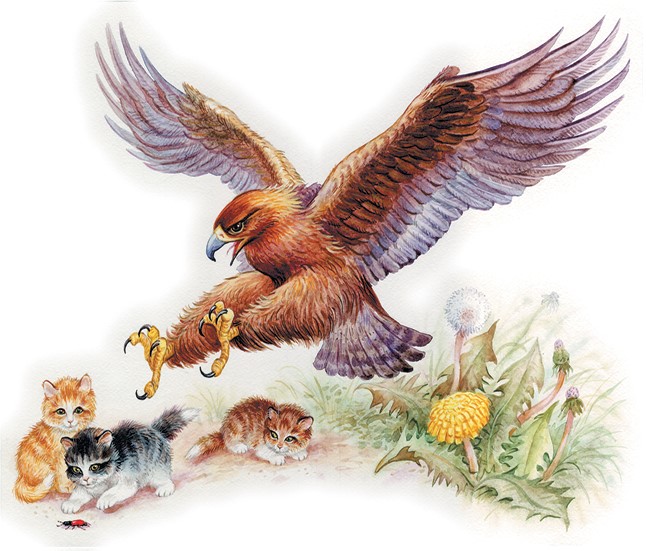 Вдруг, откуда ни возьмись, – огромный степной орёл: как молния спустился он с вышины и схватил одного котика. Но не успел ещё орёл подняться, как мать вцепилась уже в него. Хищник бросил котёнка и схватился со старой кошкой. Закипела битва насмерть.