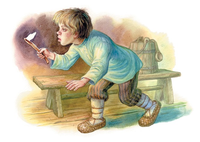 В сумерках пришёл Ваня домой, окликнул – никого в избе нет. Вот и хотел он огоньку вздуть, как слышит: кто-то на печи пыхтит. «Видно, домовой!» – подумал Ванюша, затрясся от страху, выпустил из рук лучину – да бежать. Впотьмах наступил Ваня на кочергу, а она его по лбу!