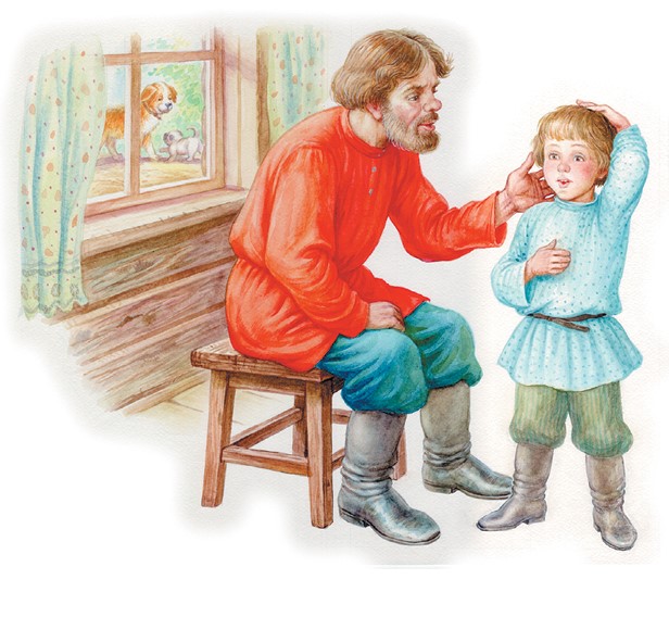 Митя накатался на саночках с ледяной горы и на коньках по замёрзшей реке, прибежал домой румяный, весёлый и говорит отцу: