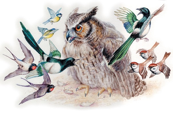 Только уже утром показался Егор из лесу. Он тащил в мешке что-то большое и живое, одна рука у Егора была обмотана тряпкой, а на тряпке видна была кровь. Весь хутор сбежался на двор к отважному крестьянину и не без страха смотрел, как он вытряхивал из мешка какую-то невиданную птицу, мохнатую, с ушами, с красными большими глазами. Она кривым клювом щёлкает, глазищами поводит, острыми когтями землю дерёт; вороны, сороки и галки, как только завидели чудище, так стали над ним носиться, подняли страшный крик и гам.