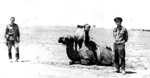 Оказалось, что руководил процессом заготовки мой начальник ДЭС Антонив, а Петро Грешников был старшим машины. Встретились, будто не виделись несколько лет, хотя это и понятно, На 500 километров вокруг ни одной живой души, и на тебе – не разъехались… Петро обратил моё внимание на каких-то бедуинов, отдыхающих возле грейдера, и предложил познакомится с ними. Я отказался, тогда он попросил хотя бы сфотографировать его на фоне экзотического пейзажа. Я просил подойти ближе к животным, но мужики из соображений безопасности не рискнули. Снимок получился не очень качественный, но памятный. Позже я не раз пожалел, что не повторил их подвиг и не оставил себе такую же память.