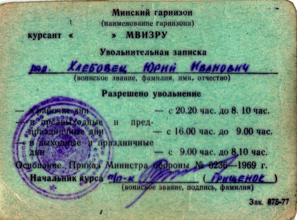 В последний день стажировки все 20 человек курсантов снова собрались в Полярном. Сходили а кино, а на обратном пути залюбовались северным сиянием, видами на залив со стоявшими там кораблями и подводными лодками. Особенно завораживал авианесущий крейсер «Минск». Вдруг кто-то заметил, что у Юры Филатова на морозе побелела щека. Тут же Слава Буравицкий растер ее снегом и перчаткой…. Утром на Филатова страшно было смотреть – половина лица была коричневой и напоминала гнилое яблоко. До сих пор, по происшествию трех с половиной десятков лет, он испытывает неприятные ощущения даже на слабом морозе.
