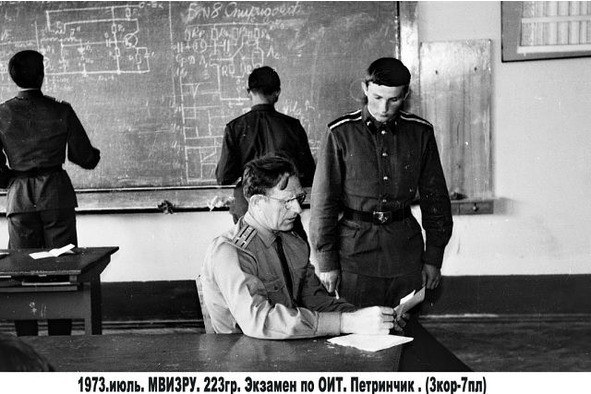 Помощь же тем одногруппникам, которым в силу различных обстоятельств было сложнее учиться, заключалась в двух направлениях. Первое-помощь на самоподготовке, обьяснение трудных тем. Второе-занос им «шпор» на экзаменах и зачетах. Занос был отработан досконально, в интересах отстающих отличники заходили первыми, затем заходили носители неудовлетворительных знаний. Отличники тайно брали у них билеты, и писали ответы. Если билеты были заранее известны, по номеру билета заносился готовый лист с ответами (часто уже со штампом училища). Активно помогали в заносах наши дорогие командиры взводов Х., Н., Л. И К. Но были случаи, когда особо принципиальные преподаватели выгоняли из аудитории и их. Они старались не конфликтовать. Так как сами были слушателями-заочниками МВИЗРУ.