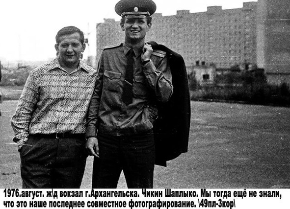 Держу в руках старую фотографию с пометкой: 13 августа 1976 года, железнодорожный вокзал г. Архангельска. На ней автор этого рассказа и его добрый и милый товарищ по учебе в Минском ВИЗРУ ПВО Александр Шаплыко.