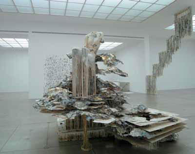 Нечто подобное инсталляциям «озимы, но более все-таки тяготеющее к какой-то, хотя и упрощенной, образности сейчас выставлено и в основном зале Сецессиона в Вене. Все пространство занимает шестичастная инсталляция «Призрачный круг. Судьбы» некой Дианы Аль Хадид. Да там, судя по какой-то брошюрке, подобные выставки инсталляций-энвайронментов уже совсем неизвестных нам арт-деятелей регулярны.