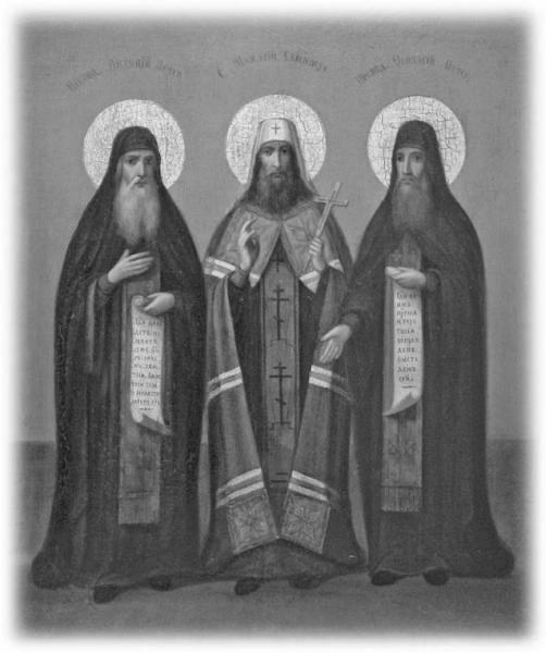 Преподобные Антоний, Макарий и Феодосий. Икона работы И. Е. Репина