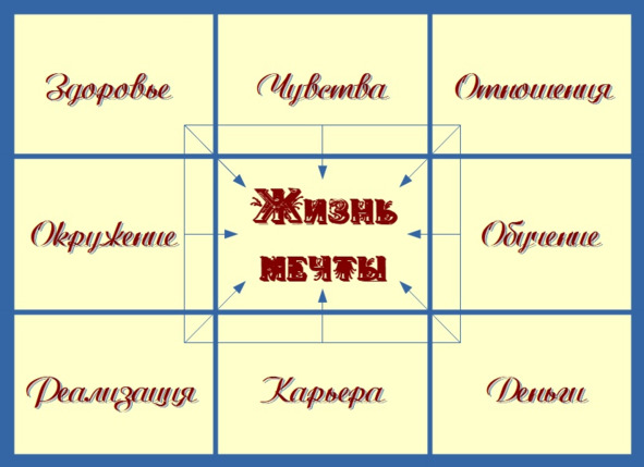Окно возможностей, ведущих к жизни моей мечты: восемь ключевых сфер жизни, из которых открывается путь к идеальному конечному результату. Важно: разные пути ведут к одному и тому же идеальному конечному результату, а не к разным результатам в разных сферах жизни, как это часто пытаются сделать игроки в известную коучинговую игру с «колесом жизненного баланса», разрывая себя одновременно на восемь разных целей и в итоге иногда не достигая ничего, кроме разочарования и усталости от бесконечной суеты!