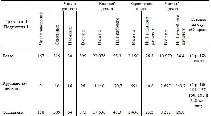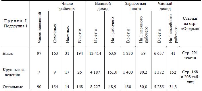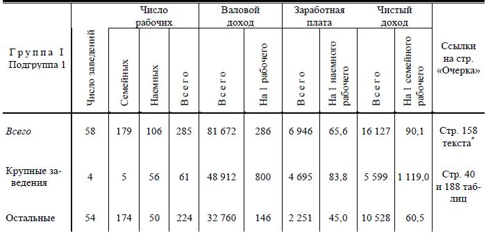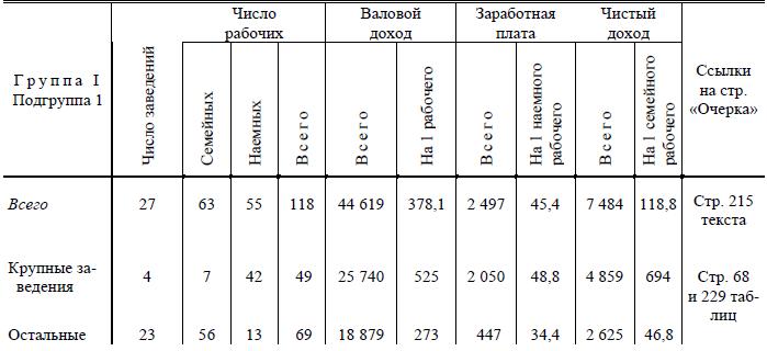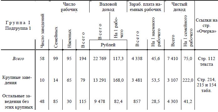 В столярном промысле в 1-й подгруппе I группы «чистый доход» семей равен «в среднем» 37,4 руб. на 1 семейного работника, тогда как средний заработок одного наемного рабочего в этой же подгруппе равен 56,9 р. (с. 131). Выделить крупные заведения по таблицам нельзя, но вряд ли можно сомневаться, что эта «средняя» величина дохода на 1 семейного рабочего есть результат сложения высокодоходных заведений с наемными рабочими (которым платят же за что-нибудь по 56 рублей) и крохотных мастерских мелких «самостоятельных» кустарей, получающих много меньше наемного рабочего.
