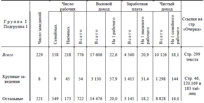 Данные о крупных и мелких заведениях мы получали таким образом: просматривались таблицы, приложенные к «Очерку», отмечались крупные заведения (когда их можно выделить, т. е. когда они не слиты с массой заведений в общий итог) и сравнивались с общими итогами «Очерка» о всех заведениях той лее группы и подгруппы. Вопрос так важен, что, мы надеемся, читатели не посетуют на нас за обилие табличек, приводимых ниже: в табличках данные выступают рельефнее и компактнее.