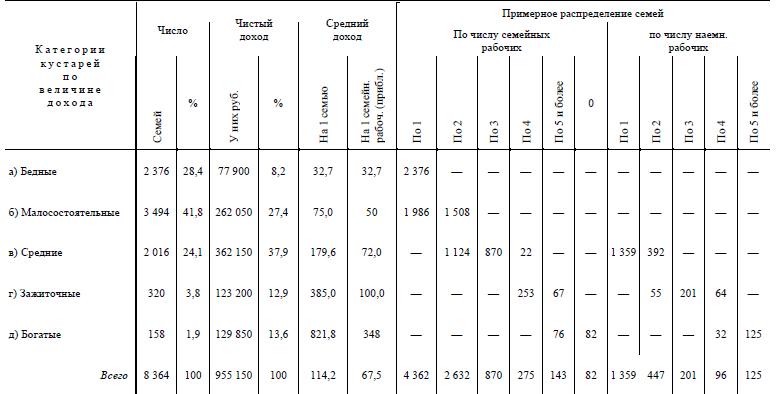 Эти данные слишком дробны, так что надо свести их в более простые и ясные рубрики. Возьмем пять категорий кустарей по доходности: а) бедных с доходом до 50 р. на семью; б) малосостоятельных – с доходом 50–100 р. на семью; в) средних – с доходом 100–300 р. на семью; г) зажиточных – с доходом 300–500 р. на семью и д) богатых – с доходом более 500 р. на семью.
