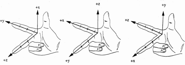 В трехмерном пространстве углы между всеми осями прямоугольной системы координат всегда равны 900. Оси системы координат, как правило, обозначаются следующими друг за другом в алфавите латинскими буквами x, y и z. Правило правой руки заключается в том, что если большой палец обозначен как ось x, то ближайший к нему указательный палец – это ось y, а следующий средний палец – ось z. Если большой палец обозначен другой буквой, то далее следует круговая перестановка в алфавитном порядке x – y – z – x – y – …, как показано на рис. 1.1. При этом направления пальцев всегда соответствуют положительному направлению координатных осей.