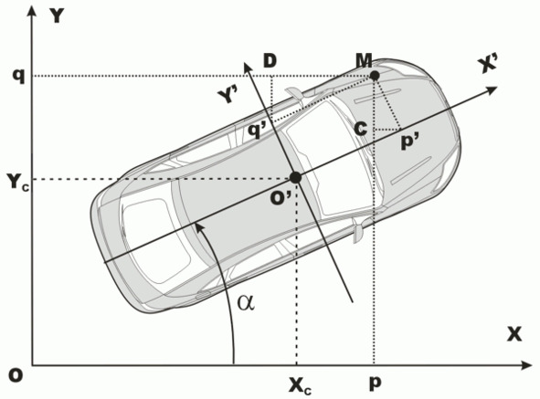 Пусть некоторая точка M задана координатами (p`,q`) в локальной системе координат X`Y`, связанной с автомобилем. Требуется найти ее координаты (p,q) в глобальной системе координат XY.