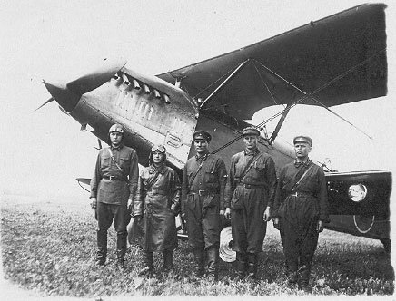 30-е годы XX века. Экипаж самолета Р-5 из 4-й оаэ ПВ командира звена капитана Ю. А. Добровольского (крайний слева), участника борьбы с басмачеством в Средней Азии в середине тридцатых годов, будущего лётчика-испытателя и Героя Советского Союза