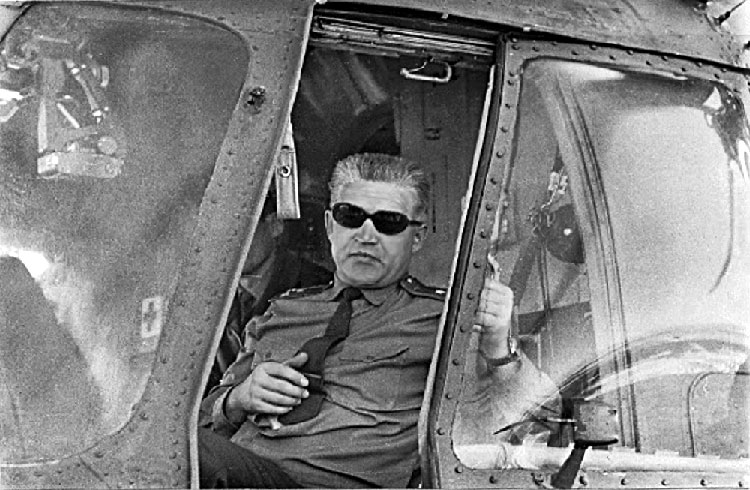 1977 год. Казахская ССР, полигон Чунджа. Командир 10-го авиаполка ПВ полковник Н. А. Рохлов на командирском кресле в кабине вертолёта Ми-8т
