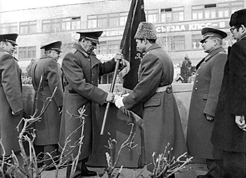Декабрь 1980 года. Казахская ССР, Алма-Ата. Заместитель начальника погранвойск КГБ СССР генерал-лейтенант И. П. Вертелко (слева в центре) вручает командиру 10-го авиаполка погранвойск полковнику А. Н. Найдёнову (справа в центре) переходящее Красное знамя за первое место в соцсоревновании среди всех двадцати авиачастей ПВ. Правее полковника Найдёнова стоит генерал Н. А. Рохлов